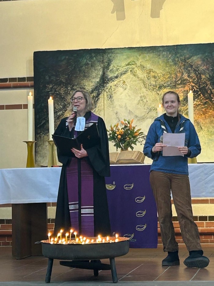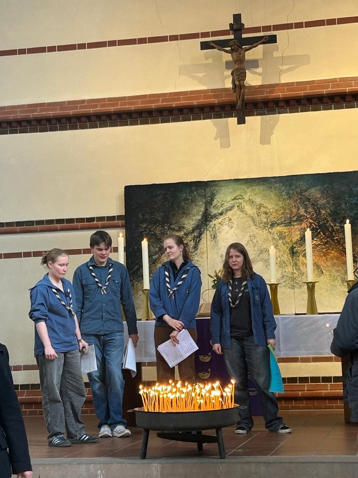 Der Gottesdienst war vielfältig, bunt und musikalisch gestaltet. In einem Anspiel reisten wir sowohl in die Vergangenheit als auch in die Zukunft der bündischen Jugend. Ein besonders schöner Moment entstand, als die gesamte Gemeinde nach vorne kam, kleine Lichter an der Osterkerze entzündete und diese in eine mit Sand gefüllte Feuerschale stellte. So entstand nach und nach ein großes Lichtermeer.