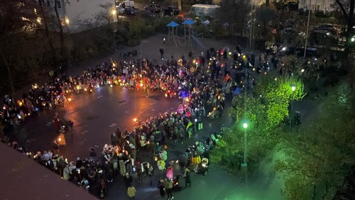 Der Beginn war traditionell wieder die St.-Marien-Kirche am Bergheimer Platz, wo die „St.Martin-Läufer“ mit Segen auf den Weg begleitet wurden. Von dort setzte sich die farbenfrohe Lichterprozession in Richtung Schulhof der Stechlinsee-Schule in Bewegung. Schon beim Eintreffen auf dem Hof war erkennbar, dass in diesem Jahr außergewöhnlich Erwachsene und Kinder mit ihren selbstgebastelten Laternen gekommen waren.