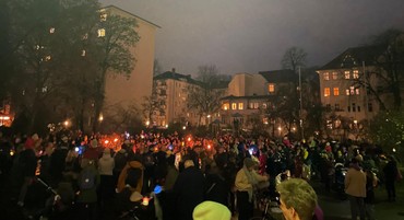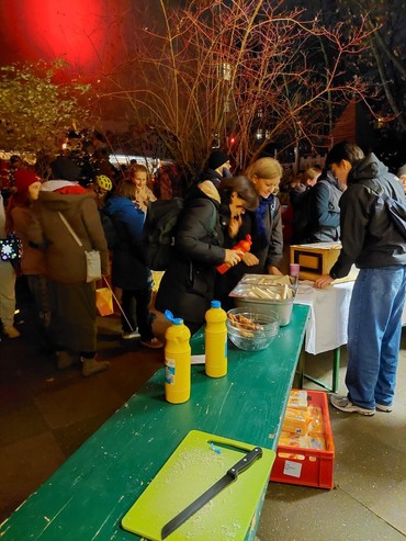 Nach dem Auszug versammelten sich noch sehr viele Menschen auf dem illuminierten Hof der Kita, wo ein engagiertes Organisationsteam der Gemeinde, von Ehrenamtlichen, CJF Jugendgruppe und Kita Paul-und-Anna zu einem geselligen Ausklang eingeladen hatte. Bei Kinderpunsch, Glühwein und heißen Würstchen klang ein ereignisreicher Abend erst viel später aus.