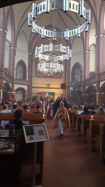 Feierlich zogen die Sternenkinder von St. Marien zum traditionellen Ökumenischen Sternsingergottesdienst am 12. Januar in unsere Kirche ein - königlich gekleidet und mit sehr viel Weihrauch. Es waren ganz kleine, aber auch große Sternensinger dabei und ihre Anzahl war gewaltig. So um die 50 Kinder waren es bestimmt, und alle hatten Freude daran uns ihre Botschaft zu verkünden.