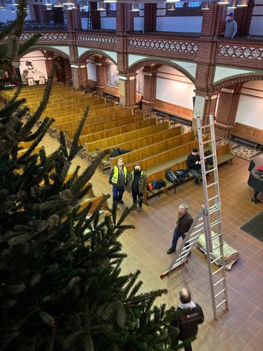 Am Ende stand der Christbaum fest an seinem Platz und wartet nun nur noch darauf in weihnachtlichem Glanz zu erstrahlen.