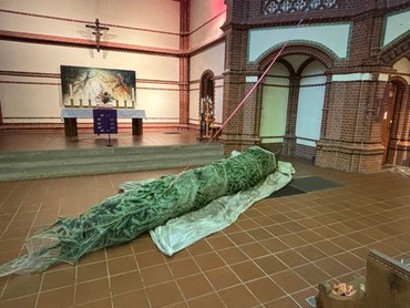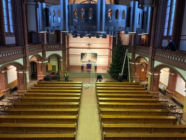 Heute war es so weit: Der Christbaum in unserer Kirche wurde in einer gemeinsamen Aktion von acht Männern aufgestellt. Jedes Jahr verlangt das Kraft, Fingerspitzengefühl, Augenmaß und Teamwork.